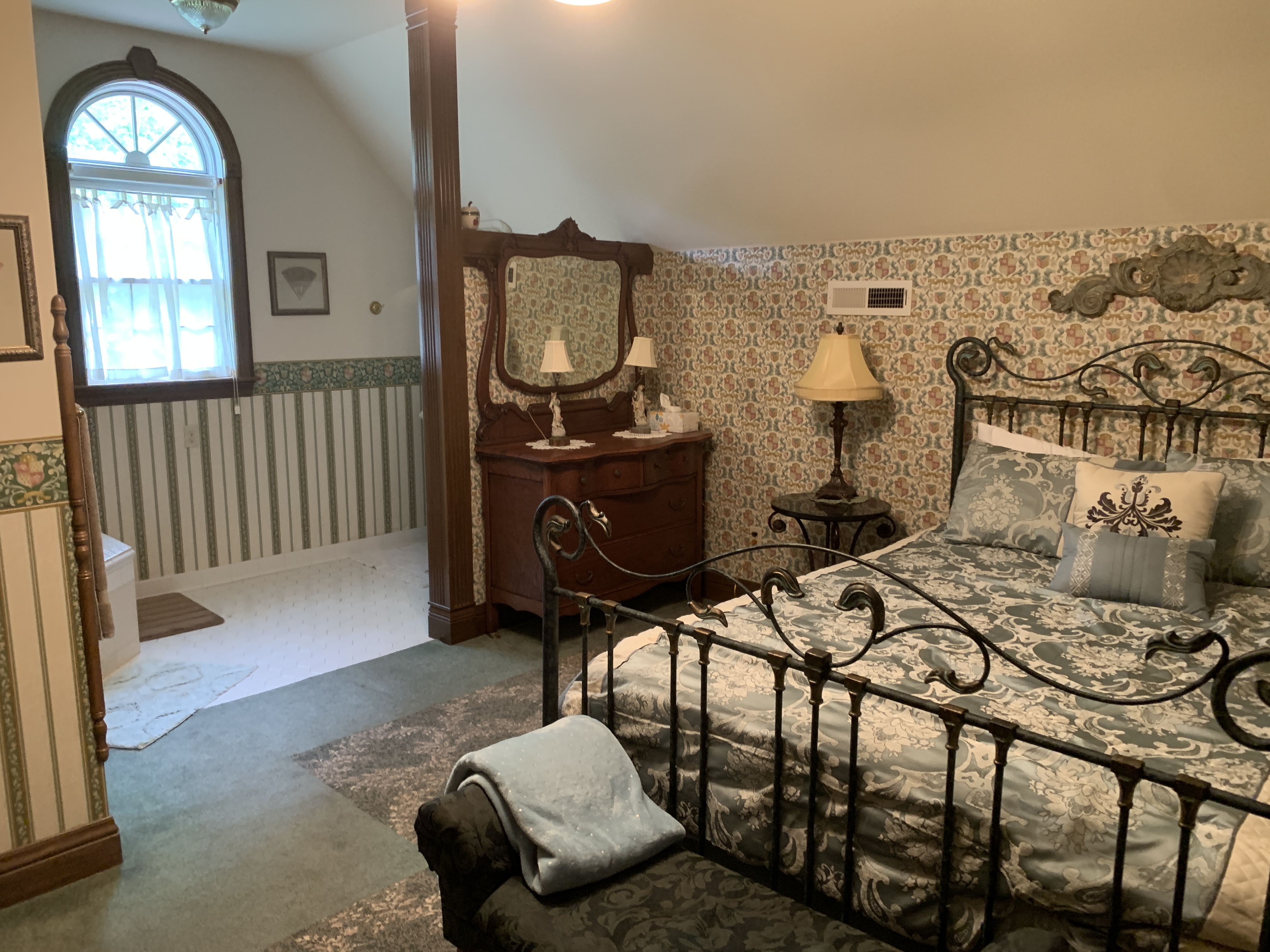The Rose RoomThe Rose room featured that true Victorian look with roses in the wallpaper and in paintings from Dianne's dad done in the 1940s. The bath has a long iron tub and shower reclaimed from olden days and resurfaced for modern use.